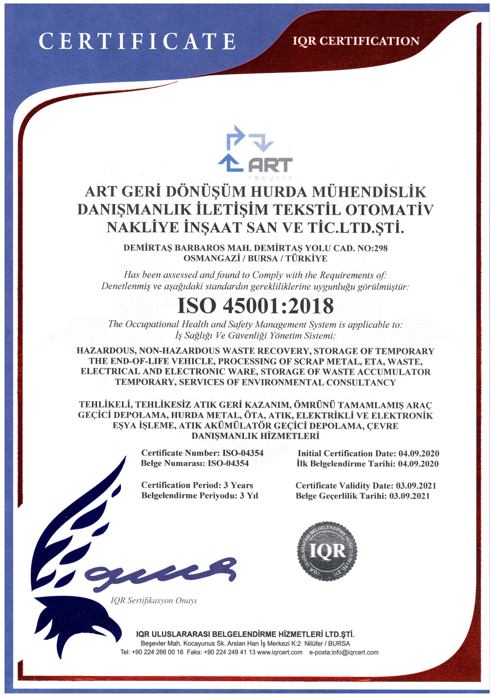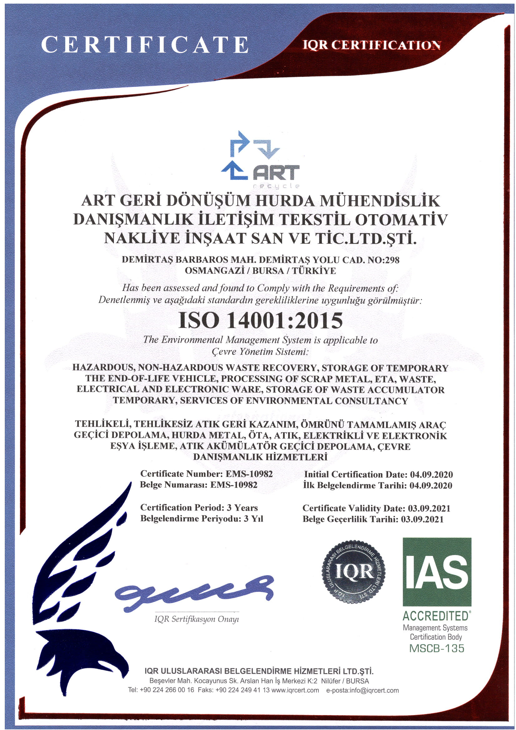ART Recycle hizmetlerini ISO 9001: 2015, ISO 14001: 2015 ve ISO 45001: 2018 yönetim sistemlerine uygun olarak sürdürmektedir. Her zaman yenilikçi bir yapı ile gelişen teknolojileri takip etmekte, bunları uygulamış olduğu yönetim sistemleri ile birleştirerek hayata geçirmektedir.